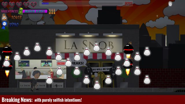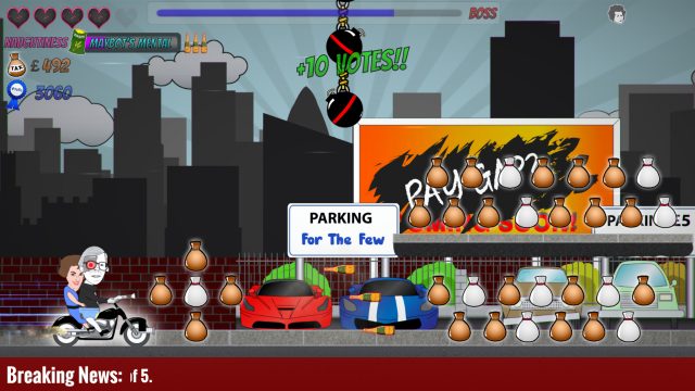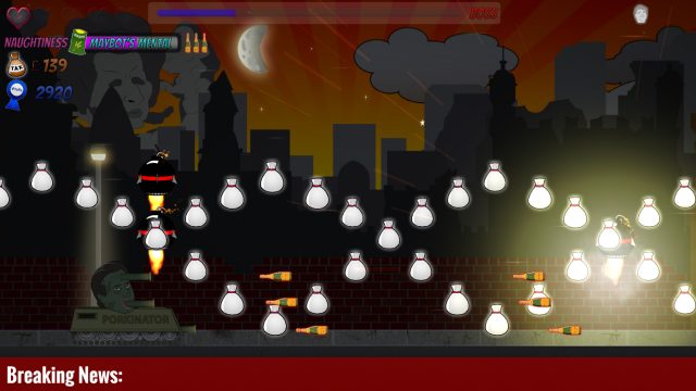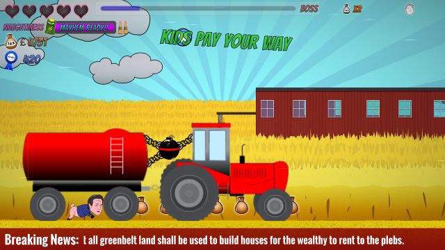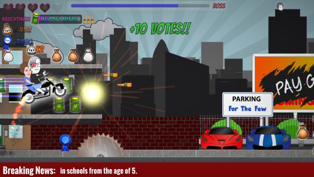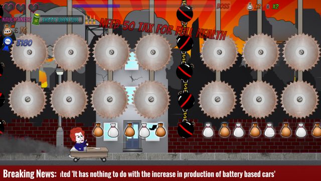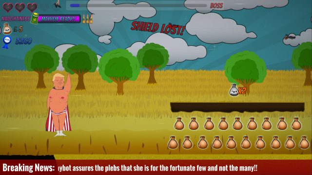 Run through randomly generated levels collecting power-ups, taxes, and votes. Jump over crazy enemies from angry farmers to missing nuclear bombs to foxes on horseback blowing bugles. Slide under tractors and ripsaws to avoid death and collect more goodies. Build up your naughtiness to unleash your ultimate form and shoot down massive bosses. Spend your